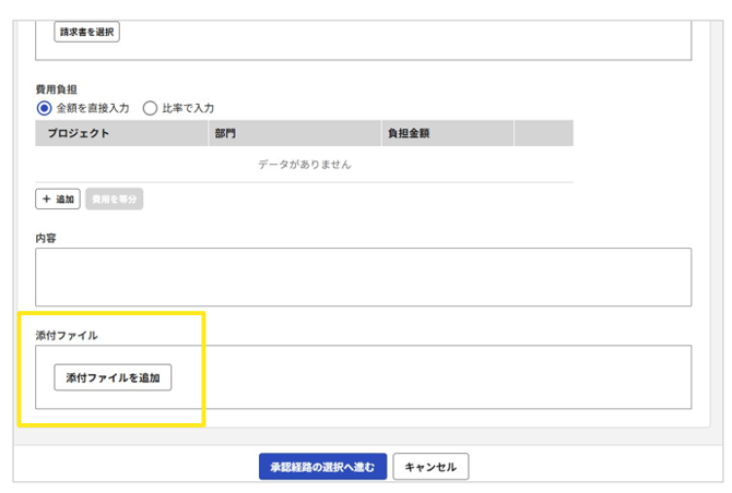 「申請」タブ>「申請内容」>「費用負担」より、上記「1. 」で確認した、適用したい承認経路に合致する「プロジェクト」もしくは「部門」を選択